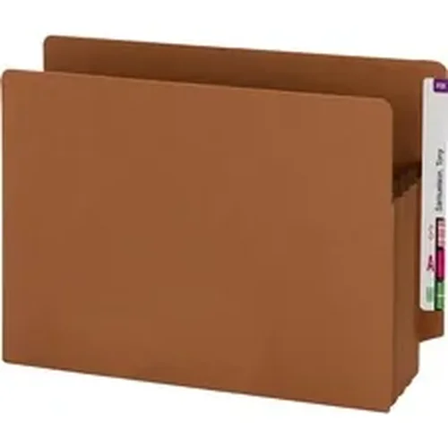 With a high percentage of recycled material, these end-tab file pockets are ideal for the environmentally friendly office. Roomy design is great for managing bulky records. Extra-wide, sturdy file pockets expand up to 3-1/2" for letter-size documents and files. Extra width accommodates standard, top-tab file folders. Rollover Tyvek reinforcement at the top of the gussets makes the sides virtually tearproof. Open top and 9" high drop front provide easy access.