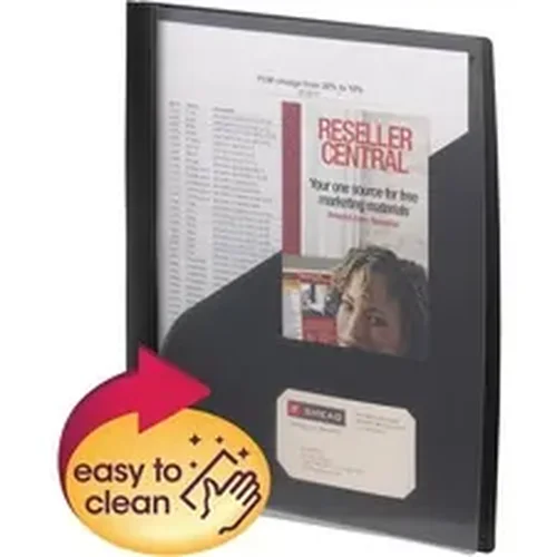 Report cover features a clear front cover to let the front page of your presentation show through in style. Durable poly material is tear-resistant, water-resistant and easy to clean to ensure your pages stay safely organized. Its large slash pocket on the inside back panel offers convenient storage for up to 25 sheets and includes die-cuts to hold your business card and tri-fold documents. Metal fasteners securely organize up to 80 three-hole punched papers without damaging your documents or binder hinge. Report cover is designed for use with letter-size papers.
