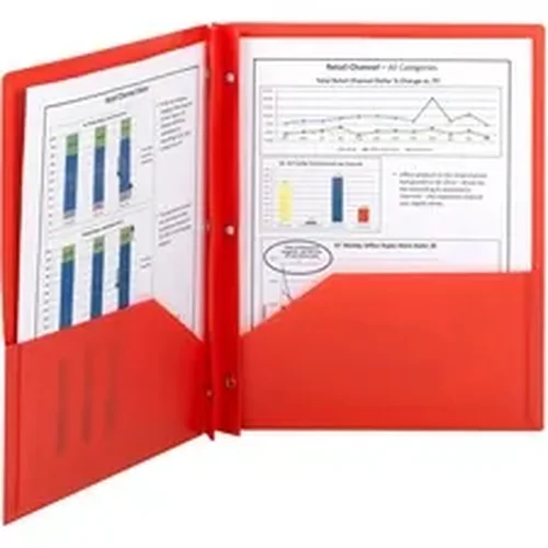 Keep documents organized and safe using these Poly Two-pocket Folders with fasteners. They are perfect for all types of presentations, proposals and projects. They allow easy storage and transport while keeping your letter-size documents organized and easily accessible. Two large, 4-1/2" high pockets each hold up to 50 sheets. Metal, tang-style fasteners hold up to 80 three-hole punched papers. Inside back pocket is die-cut to hold a business card. Durable poly material is tear-resistant, water-resistant and easy to clean.