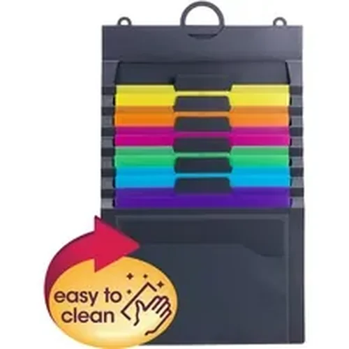 Cascading Wall Organizer Gen 2 saves desk space by utilizing often-overlooked wall space. The six cascading pockets are removable to make viewing and access to documents easy. An elastic cord closure allows secure and easy transport. Brightly colored pockets each hold 25 sheets. Clear pocket on front offers extra storage. Convenient loop on top allows easy hanging. Durable, acid-free polypropylene material is tear-resistant and water-resistant. Sleek wall organizer includes a blank label sheet.