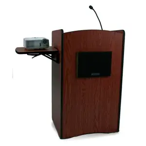 Multimedia Computer Lectern features a slide-out locking shelf for your keyboard and two locking doors to provide secure storage for equipment. Use the slide-out locking shelf for projectors and adjustable inner shelf for computer and AV material. Adjustable shelf measures 24" wide x 17-1/2" deep. The lectern is equipped with wire-management grommets for easy cord management and four heavy-duty hidden casters for easy movement from one presentation location to the next. Two casters lock for a stability. Design includes high-quality laminate heat-fused with stained pine wood finish, radius corners, skirted base and rounded top sculpted top profile.