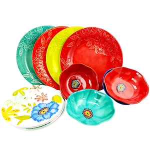 Enhance your dining experience with the Studio California by Laurie Gates Flora 12-Piece Dinnerware Set. This vibrant melamine set includes four place settings in eye-catching colors: red, orange, green, and yellow. Each set features solid-color dinner plates along with beautifully embossed floral designs on the dessert plates and bowls. With its stunning colors and decorative scalloped bowls, this dinnerware set is designed to make every meal a celebration, whether it's an everyday meal or a special occasion.