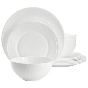 Featuring a complete service for four, the Swanton set includes four dinner plates, four dessert plates, and four bowls, making it perfect for family gatherings or entertaining guests. It is dishwasher, microwave, and freezer safe, ensuring convenience in meal preparation and cleanup.