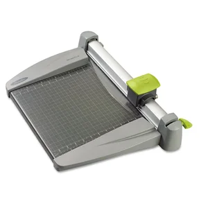 Heavy-duty trimmer with a rotary blade features a large, metal base that's perfect for everyday or specialty paper trimming. 12" cutting length offers high-capacity, rotary cutting of up to 30 sheets at once. Alignment grid and dual scale ruler offer a precise way to measure before you make your cuts. Blade edges are concealed by the rotary trimmer for safe use. Trimmer is excellent for cutting oversized documents and high-volume projects.