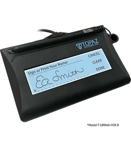 The Topaz SigLite LCD 1x5 is a small electronic signature capture pad with transflective LCD that displays “electronic ink” under the pen tip during signing. Bundled secure software APIs provide for interactive text, graphics, and pen-tap hotspots and check boxes which enable users to navigate screens and select preferred options.