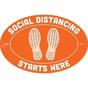 BeSafe Messaging Floor Decal with the message, "Social Distancing Starts Here," is great for use on most floor surfaces in public. Message in white on the orange background also includes two shoes to depict the recommended action of standing where designated. Floor Decal alerts all those in the vicinity to avoid close contact and maintain your distance when around others. Engineered to provide clean, smooth removability from most surfaces, high-performance, anti-slip vinyl is repositionable and features pressure-sensitive adhesive for easy application. Use on glass, metal, painted surfaces, smooth concrete and some plastics with minimal peel-build over time, but performance can vary depending on conditioning so testing on your surface is recommended. The 10 mil floor decal is not recommended on carpet.