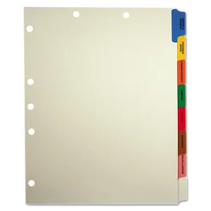 Eight side tab, pre-collated sets include seven of the most popular medical index titles used today, plus one writable tab. Dividers are made of sturdy, 90 lb. manila stock. Tabs are reinforced with tearproof color Mylar. Tab titles include "History & Physical" (blue), "Progress Notes" (yellow), "Correspondence" (orange), "Lab/X-Ray" (green), "Hospital" (red), "Insurance" (brown), and "Miscellaneous" (pink). Set also includes a blank tab.