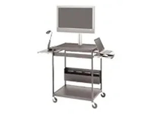 This mobile cart includes a top shelf for projectors and presentation materials, along with two pull-out shelves for laptops and document cameras. Additionally, it offers a mounting pole for flat panel monitors up to 42 inches with a 200mm VESA mounting pattern.