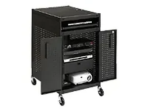 The Bretford Basics Welded Cabinet Presentation Cart is designed to support multiple AV devices such as projectors, laptops, and document cameras. Its welded frame ensures easy assembly while providing durability. The cart features a locking lower cabinet with a 19" rack mount for secure storage and easy access to cords through its front and rear doors.