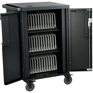 The Bretford CoreX Mobile Cart is designed to securely store and transport up to 36 tablets or notebooks. The sleek black cart features a rear door for easy access, ensuring efficient device management in any educational or professional environment.
