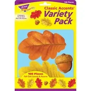 Celebrate the seasons and add a touch of nature to any display with this Classic Accents Variety Pack. Label storage, lockers and centers. Create eye-catching displays, showcase student work, inspire creativity, and reward success. These fall oak leaves and acorns provide endless ways to energize, delight and engage. The set includes 36 acorns, 72 left-facing and right-facing leaves in three colors. They are 4-1/2" long, pre-cut and ready to use. They are also durable and reusable so you can use them in your classroom for many years.