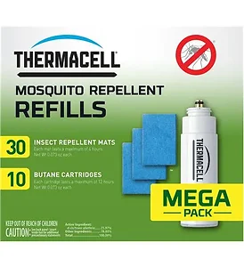 30 repellent mats and 10 fuel cartridgesOdorless, no spray mosquito protectionNo oily, messy lotions or spraysCompatible with any fuel-powered Thermacell repeller, lantern or torch; Thermacell refills keep outdoor adventurers on-the-go: hikers, campers, backpackers, farmers, ranchers, scouts and huntersEnjoy an effective 15-foot by 15-foot invisible zone of protection against pesky mosquitoes at the pool, beach, lake, campsite, ranch, cabin, ball field or trail No-DEET or On-Skin Chemicals – Original, scent-free Thermacell Mosquito Repellent delivers effective no-spray zone of protection covering 15-ft zone; protects against mosquitoes without the mess Long-Lasting – Contains 30 repellent mats lasting 4 hours each and 10 fuel cartridges lasting 12 hours, delivering 120 hours of mosquito protection; conveniently stop and start as often as needed Trusted and Highly Effective – Innovative zone mosquito repellent technology from Thermacell provides a mess-free and DEET-free solution much more effective candles or torches Universal Fuel Powered Thermacell Refill – Refills work with any fuel-powered Thermacell repeller, lantern or torch; easily replace repellent cartridges and mats according to device instructions Portable and Easy-to-Use – Enjoy outdoor adventure, seize the day and keep bugs at bay, whether relaxing, barbequing, camping, backpacking, fishing, boating, hiking or enjoying the backyard