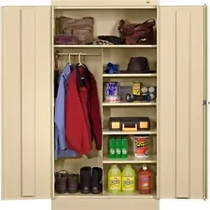 Versatile Combination Cabinet can handle coats, hats, supplies and much more. Ideal where space is at a premium. Shelves adjust in 2" increments. Design offers heavy-duty construction, reinforced doors and a three-point door locking mechanism for maximum security. Raised base keeps cabinet contents from contact floor moisture. Combination cabinet includes a coat rod.