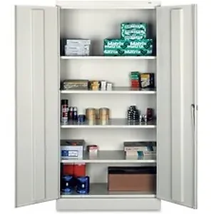 Standard-size storage cabinet features premium-quality steel throughout for maximum rigidity. Dual swing-out, reinforced doors ride on heavy-duty leaf-hinges. Three-point locking system ensures secure storage for bulky materials. Simply turn the polished chrome handle and doors lock at three points for maximum security. Nylon guides help make operation quiet. Cabinet base offers a "box" construction technique to prevent racking. Punched lances in back facilitate ventilation. Raised base keeps contents out of harm's way from cleaning liquids. Storage cabinet also includes four adjustable steel shelves that you can move in 2" increments without tools. Each shelf holds up to 150 lb. Cabinet comes with two keys.