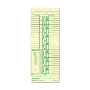 Weekly time cards feature a seven-day time period to record regular hours, deductions, gross and net pay and four days overtime. Time cards are designed for full payroll deductions with weekly numbered days. Extra-heavy, 143 lb. manila stock is printed in green ink on front. Time cards replace No. 1900L and are designed for use in Acroprint 125R, 150R, ES700, ESP180, 175TR; Amano PIX and TCX Series; Cincinnati 1000, 10000; Lathem 900E, 1200, 1500E, 2000, 4000, 5000EP; Simplex KCF, KCG, JCG, JCP and 2500.