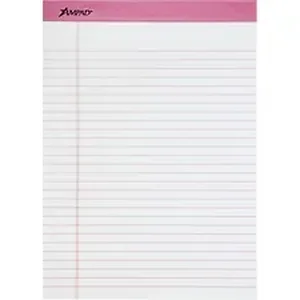 Perforated pad with distinctive pink binding and ruling features heavyweight, 60 point, chipboard backing. Letter-size sheets are microperforated for clean, easy removal. Each writing pad contains 50 ruled sheets of high-quality, 20 lb. white paper. Each sheet has 11/32" line spacings and a 1 1/4" left margin printed in pink ink.