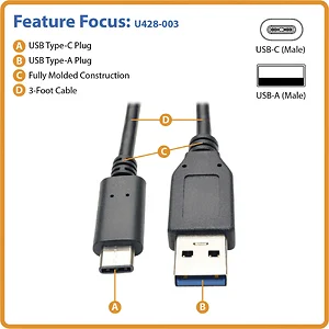 Eaton U428-003 EXTENSION CABLE - USB-C LEFT CONNECTOR - MALE LEFT GENDER - USB-A RIGHT CONNECTO
