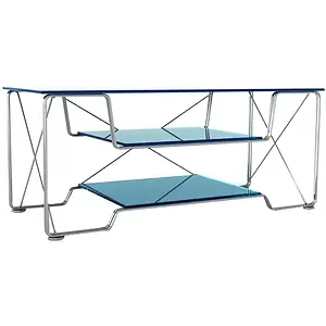 The Uptown Silver and Blue A/V TV Stand combines modern design with functionality, providing an excellent storage solution for your entertainment setup. Its sleek silver frame and blue glass shelves offer a contemporary aesthetic, making it a perfect fit for any urban living space.
