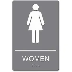 Women's restroom sign features an easily recognizable graphic for high visibility. Raised tactile graphic is designed with Grade 2 braille to create a more efficient display. Double-sided adhesive tape lets you quickly mount the sign to a smooth door or wall.