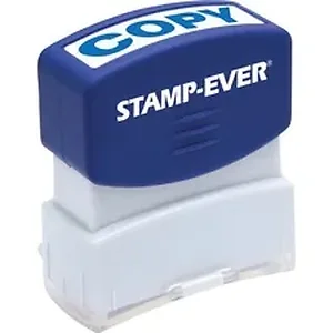 Pre-inked, one-color stamp imprints the word COPY in bold blue, uppercase letters. Microporous ink surface produces a clean, crisp impression every time. Design features a soft-touch grip and flip-open lid. Message stamp offers an impression size of 9/16" x 1-11/16". TAA-compliant stamp lasts for 50,000 impressions before re-inking.
