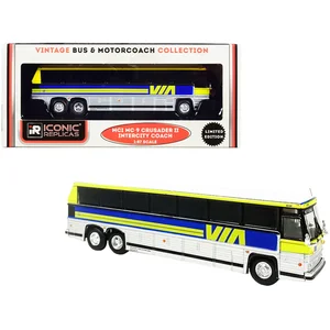 This detailed 1/87 (HO) scale diecast model represents the iconic 1980 MCI MC-9 Crusader II Intercity Coach Bus featuring the distinctive 'Via Rail' livery in yellow and silver with blue stripes. A part of the Vintage Bus & Motorcoach Collection, this model captures the vintage charm and design aesthetic of intercity travel buses. Whether for display or as a collector's item, this bus model embodies quality craftsmanship.