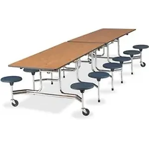 Popular Virco mobile stool tables are designed to accommodate 12 or 16 students in cafeterias and related settings. Each table features a sturdy 3/4" thick top with a high-pressure laminate surface and backing sheet that help seal out moisture to prevent warping. A specially designed torsion bar helps you fold and unfold and the table quickly and smoothly. High-impact ABS plastic stools are securely attached to their columns by means of an inset washer, a hex bolt and an aircraft lock nut. This 12-seat table has standard T-mold edge banding.