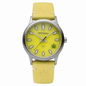 The 420Waldos MaryJane W2008 watch combines style and purpose in a remarkable timepiece. Inspired by a storied cannabis culture, this watch not only tells time but also advocates for cannabis legalization. Featuring a robust stainless steel case and a vibrant yellow dial, it is sure to make a statement.