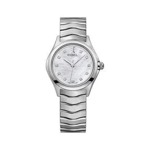EBEL 1216267 Wave Mother of Pearl Diamond Dial Ladies Watch The Stainless steel case with a stainless steel bracelet. Fixed stainless steel bezel. Mother of pearl dial with silver-tone hands and 11 diamond hour markers. Dial Type: Analog. Quartz movement. Scratch resistant sapphire crystal. Pull / push crown. Solid case back. Round case shape. Case size: 30 mm. Case thickness: 8 mm. Band width: 15 mm. Deployment clasp. Water resistant at 50 meters / 165 feet. Functions: hour, minute, second. Additional Info: dial set with 11 diamonds (0.043 carats). Dress watch style. Watch label: Swiss Made. Ebel Wave Mother of Pearl Diamond Dial Ladies Watch 1216267. Features: Brand: Ebel Series: Wave Model number: 1216267 Case Shape: Round Crystal: Scratch Resistant Sapphire Display Type: Analog Clasp: Deployment Case material: Stainless Steel Case size: 30 mm x 8 mm Band Material: Stainless Steel Band Color: Silver-tone Dial color: Mother of Pearl Bezel material: Stainless Steel Bezel function: Fixed Movement: Quartz Water resistant depth: 50 meters / 165 feet