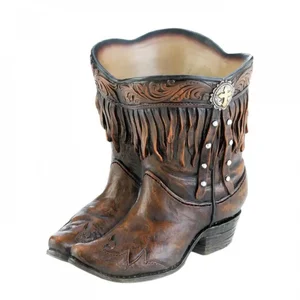 Add a touch of the Wild West to your garden or home with this charming cowboy boot planter. Made to resemble a pair of well-loved cowboy boots, complete with fringe and a shiny Western medallion, it's perfect for showcasing your favorite plants. This unique planter is crafted from durable polyresin, ensuring it will withstand exposure to the elements while maintaining its playful appeal.