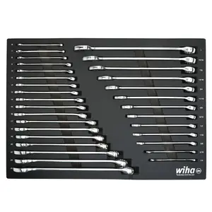 The Wiha 31-Piece Combination Wrench Tray Set includes both SAE and Metric sizes, making it an essential addition to any workshop or toolbox. Each wrench is crafted from high-quality chrome vanadium steel, ensuring durability and longevity. The set is neatly organized in a sturdy tray for easy access and storage.