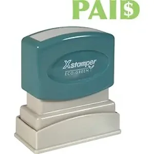 PAID Title Stamp with light green ink is pre-inked for 100,000 impressions and re-inkable for 100,000 more, again and again. Patented cellular inking process delivers clean, consistent impressions. Retractable frame keeps stamp surface away from desktop until ready to use. Impression size is 1/2" x 1-5/8". Pre-inked stamp contains a high percentage of recycled material.