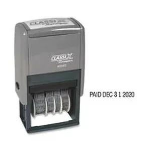 Plastic, self-inking, message date stamp has an 11-year band. Printed phrases are REC'D, ENT'D, ANS'D, PAID, SHIP'D, CHG'D, CANC, BAL, C.O.D., FILLED, FILED and RET'D. Each prints in black. Impression size is 15/16" x 1-3/4".