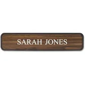 Designer wall sign with rounded corners is perfect for any modern office environment. It has been engineered as a quality interior sign systems so it can be used for a door or a wall. Distinctive professional look is perfect for offices, courthouses, schools and warehouses. Choose from more than 35 fonts and more than 30 plastic insert colors. Contact customer service to customize the plastic, 2" x 10" sign with a brown frame.