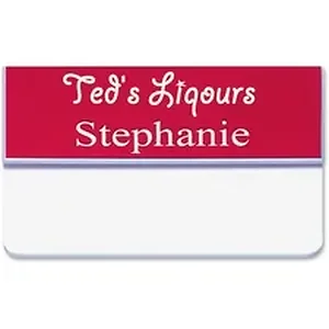 Keep your shirts undamaged and pinned free with this pocket name badge. It offers a clean, neat way to display your name. The pocket badge slips over the pocket and holds itself in place. Badge measures 1" x 3". Customize with a maximum of two lines and your choice of more than 35 fonts and 20 varieties of plate colors. The large size allows room for a logo. Badge is made of high-grade, durable plastic.