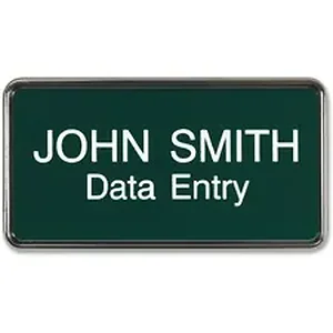 Framed name badge offers a clean, neat way to display your name. Silver-colored border frames your name for an elegant look. Badge measures 1-1/2" x 3". Customize with a maximum of two lines and your choice of more than 35 fonts and 20 varieties of sign colors. Badge is made of high-grade, durable plastic.