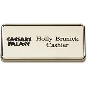 Framed name badge offers a clean, neat way to display your name. Gold-colored border frames your name for an elegant look. Badge measures 1-1/2" x 3". Large size allows rooms for a logo. Customize with a maximum of two lines and your choice of more than 35 fonts and 20 varieties of sign colors. Badge is made of high-grade, durable plastic.