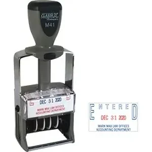 Self-inking date stamp delivers up to four lines with 25 characters per line. Ideal for messages, dates and information. No stamp pad required. Heavy-duty plastic frame provides years of service. Stamp has replaceable ink cartridges and contains a high percentage of recycled material. Contact customer service to customize stamp. Complete orders are shipped within 48 hours of receipt by Xstamper.
