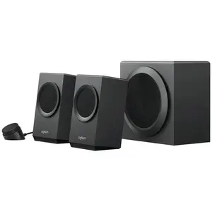 Get ready to crank up the music with this high-quality Desktop Speaker, brought to you by Logitech. This bold sound is made from 80 watts of peak power, a z333 that will deliver powerful acoustics across a full frequency range, with a deep bass response. The omnidirectional speaker has 40W of RMS power. The 2.1 speaker has a front-facing subwoofer that produces a deep and powerful bass sound that you can adjust with a separate knob. Add a new dimension to all of your music, movies and games. 3.5mm and RCA inputs will allow you convenient connectivity to all of your favorite devices.